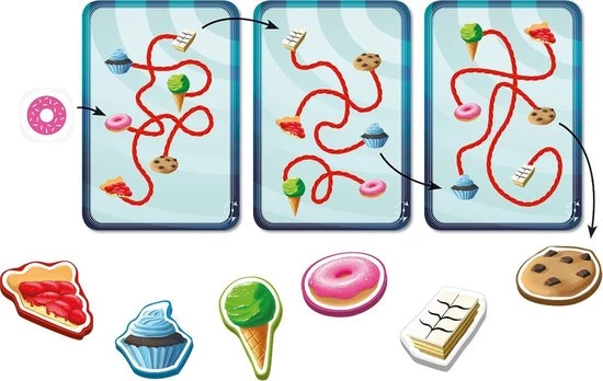 Snel zoekspel voor jong en oud! Je bent een lief monster, dat een grote voorliefde voor desserts heeft. Er is er echter maar ??n die een toetje mag eten! Ben jij degene die het juiste toetje als eerste vindt? Een dobbelsteen bepaalt waar de spelers met zoeken moeten beginnen. Volg dan de dropsliert helemaal naar de andere kant en pak zo snel mogelijk het bijbehorende fiche. Wie als eerste 5 desserts heeft gegeten, wint dit vrolijke zoekspel!