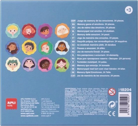 Emoties memory uit Expressions collectie. Het bevat 24 stukken om de 12 verschillende emoties te associ?ren en het geheugen te stimuleren. Gemakkelijk voor de kinderen om mee om te gaan: stoere stukken, veilig en makkelijk te hanteren. 2 mm dikke kaart met een matte afwerking en Indiana op de rug.