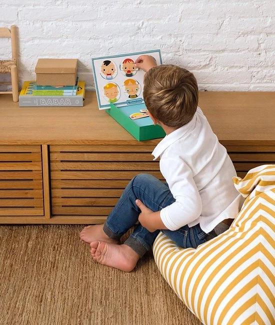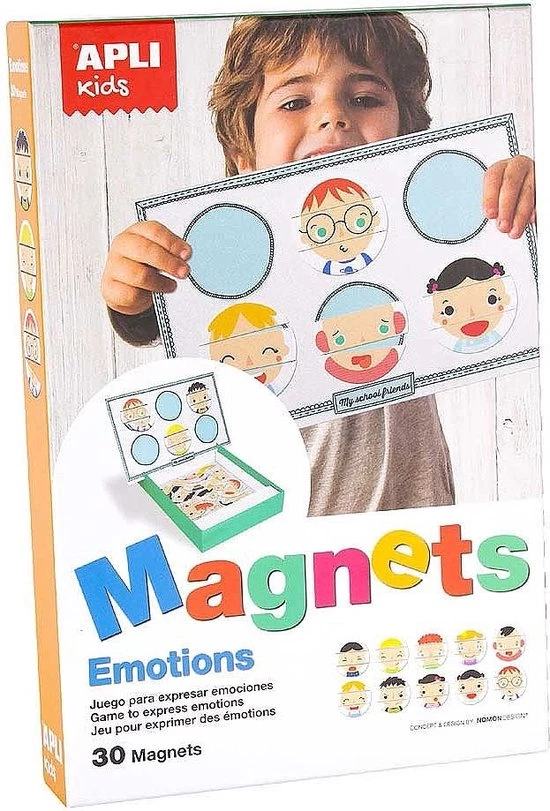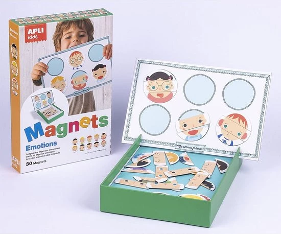 Magnetisch speelgoed om gezichten te combineren, om verschillende emoties te maken. Kinderen kunnen op een afneembaar paneel spelen dat op de doos past.