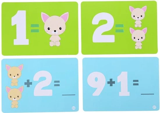 De moeilijkste spelvorm is gericht op het ontwikkelen van de rekenvaardigheden. Op de kaartjes staan rekensommetjes die opgelost moeten worden. Leg de bijbehorende getallen en kittens op de weegschaal om de weegschaal in balans te brengen.