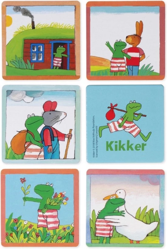 Een memospel met kleurrijke afbeeldingen van Kikker en veel van zijn vriendjes uit de boeken van Max Velthuijs. Iedereen kent dit geheugenspelletje en kinderen zijn er dol op. Deze set bevat 40 kaartjes van zeer stevig karton. Voor kleinere kinderen is het verstandig eerst met een beperkt aantal kaartjes te beginnen. Alle vriendjes van Kikker zoals Rat, Konijn, Gans en Beer vind je in dit spel terug.