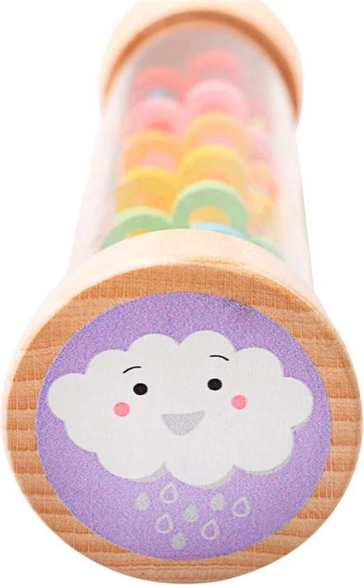 Bigjigs houten rainmaker regenmaker. Draai deze houten regenmaker om en zie de kraaltjes zachtjes naar beneden vallen. De zachte regendruppelgeluiden geven de kleine een fijn gevoel. De verdiepingen in de regenmaker hebben vrolijke kleuren net als de kralen. De zijkanten van de regenmaker zijn bedrukt met een wolkje en een zonnetje . De regenmaker is ook te gebruiken als een rammelaar. Geschikt vanaf 1 jaar.