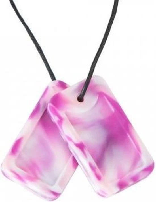 Chewigem Bijt-Ketting Dog Tags Swirl Door het stoere ontwerp en de buigzame siliconen ID plaatje is deze Bijt-Ketting erg populair Kinderen met prikkel verwerkingsproblemen hebben vaak moeite om alle informatie, die via de verschillende zintuigen binnenkomt, te ordenen. Hierdoor kunnen ze overspoeld raken door alles wat om hun heen gebeurt. Om zich af te sluiten voor andere prikkels hebben ze de neiging om op iets te kauwen. Dit kan zijn om geconcentreerd te blijven of om spanning kwijt te raken (bijvoorbeeld eten, op een pen kauwen, op kleding of sieraden kauwen, op nagels bijten). Het kauwen heeft een kalmerende werking en helpt ze om zich beter te focussen. Deze ketting bestaat uit 2 hangers in de vorm van een ID plaatje. Samen, dan wel met 1 plaatje te gebruiken, zodat je altijd een reserve hebt. Categorie: lichte kauwbehoefte Wasbaar (zelfs in de vaatwasser, ketting zelf niet) Met veiligheidssluiting (sluiting niet om op te kauwen)