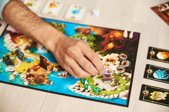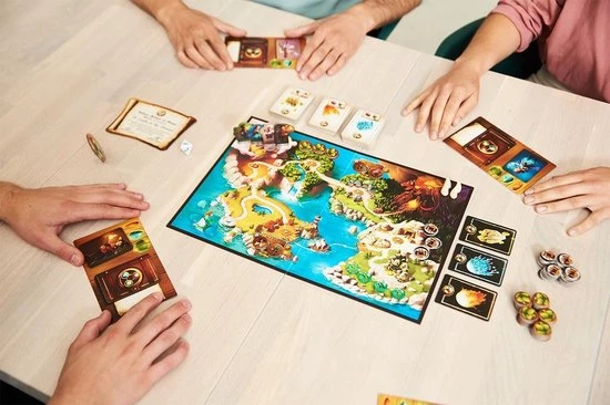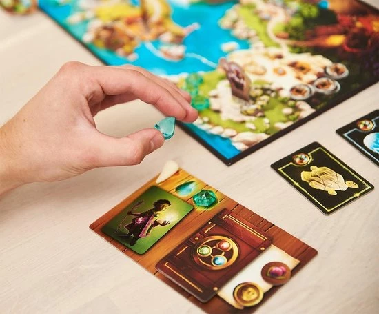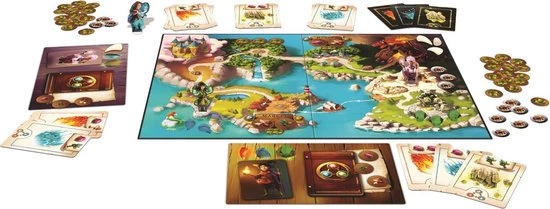 Inhoud: Speelbord, 8 speelfiguren, 4 dubbelzijdige verzamelkaarten, 18 spreukkaarten (vuur, water, steen), 80 ingredientenfiches, diploma, 3 duelkaarten, 12 schatten, spelregels en dobbelstenen.