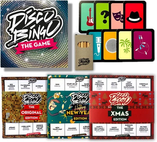 Disco Bingo The Game Box inclusief The Xmas Edition én The Happy New Year Edition! Geen bingokaarten met getallen, maar Disco Bingo om thuis te spelen! De enige echte muziekbingo, het leukste alternatief voor een popquiz. Bingokaarten met bekende popsongs erop. Pimp je avonden of feestjes voortaan met lol, muziek en gezelligheid! Speel één van de bijgesloten edities; draai de bijbehorende liedjes voor 30 sec. af met de gratis app. Schud je telefoon om de digitale bingomolen te activeren. Hoor je een nummer voorbij komen die op je kaart staat, streep je ‘m af. Rijtje vol: bingo! Speel door voor de volle kaart, maar pas op: bij valse of dubbele bingo’s wordt er een tegenprestatie of battle verwacht. De bijgeleverde schaamkaarten vertellen je wat dat wordt: zingen, dansen, air guitar spelen, een mop vertellen en nog veel meer. Hilarische situaties gegarandeerd!