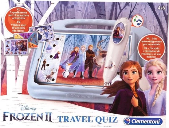 Leer plezier maken met de Frozen 2 Travel Quiz. Een spel om altijd bij je te dragen dankzij het comfortabele draagbaar tekenbord, de interactieve pen, 18 activiteiten om woorden, cijfers, vormen en nog veel meer te leren.