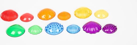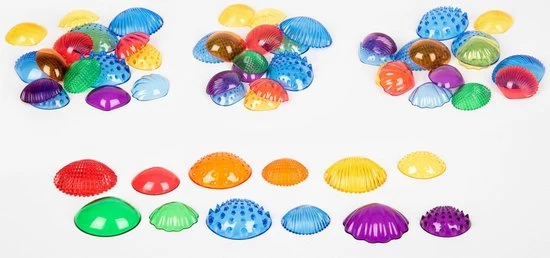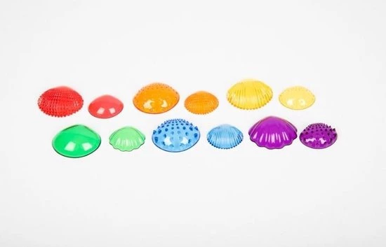 Prachtige doorzichtige gekleurde zeeschelpen in 2 groottes en 6 kleuren met 6 verschillende voelbare oppervlakken. Kinderen zullen dol zijn op het aanraken en voelen van deze schelpen, het beschrijven van de verschillen en overeenkomsten en het ontdekken van de kleuren en mogelijkheden om de kleuren te combineren. Ideaal om vroeg cijferconcepten te leren zoals sorteren, combineren, vergelijken, opeenvolging, patronen en tellen.