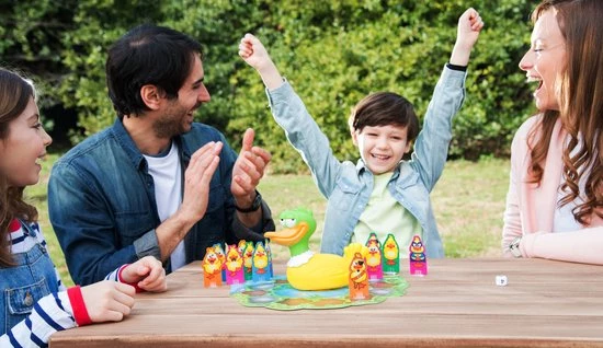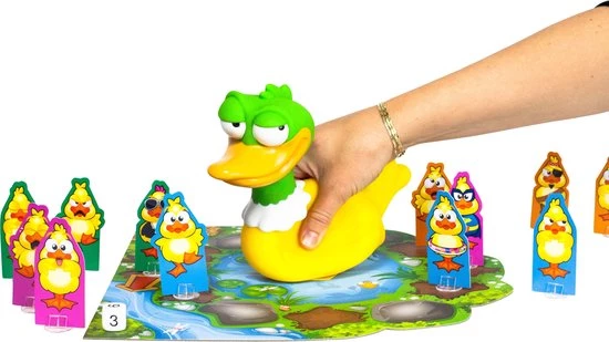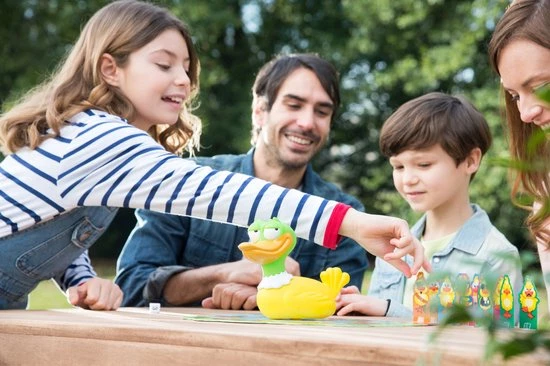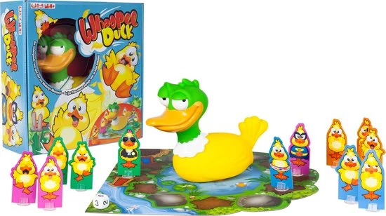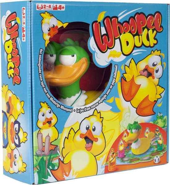 Breng je eendjes naar het water, maar pas op! Wat is dat voor gek gesnater?! Whoopee laat de hardste winden. Zorg er dus voor, dat Whoopee jou niet weet te vinden! Ontwijk de winden en bereik zo snel mogelijk het water! Super grappig gezelschapsspel voor maximaal 4 personen.