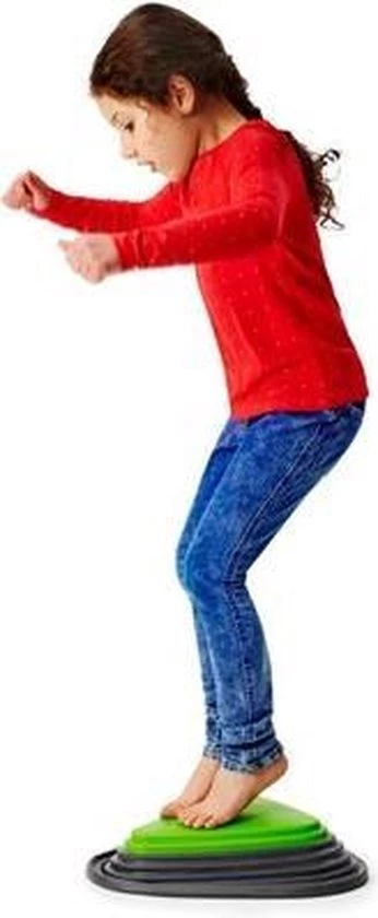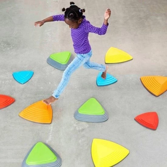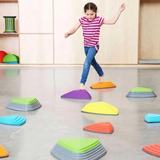 Deze nieuwe versie van de River Stone heeft een zachte basis en een hard-top platform ondersteund door drie sterke stalen veren om stuiteren mogelijk te maken. Stappen en springen op de stuiterende rivierstenen is fysiek moeilijker door het stuiteren door de enkels en benen is vereist, wat het gevoel versterkt. De Stuiterende Rivierstenen kan alleen worden gebruikt voor speciale motortrainingsactiviteiten of samen met de Rivierstenen om nog meer speelmogelijkheden te bieden. Vanaf 2 jaar.