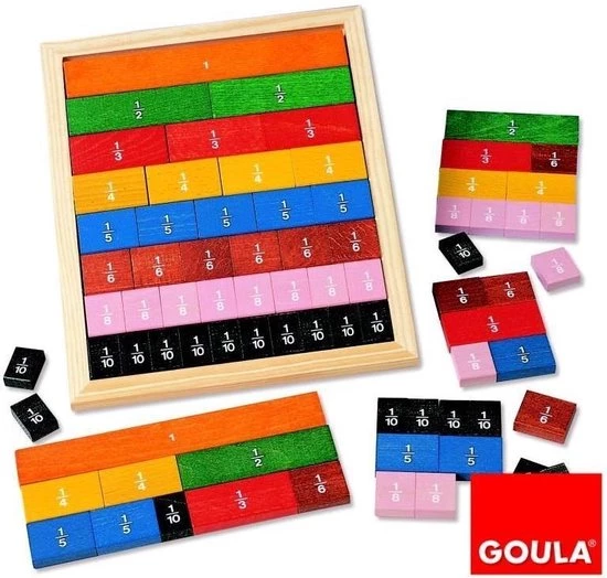 Mooie houten plaat met losse stukjes ‘breuken’ in 8 verschillende kleuren. Spelenderwijs krijgen kinderen meer begrip van de verhoudingen tussen verschillende breuken. Zowel visueel als fysiek. Algemene informatie over Goula: Dit van oorsprong familie-bedrijf maakt al sinds 1942 houten speelgoed. De artikelen staan bekend om hun eenvoud en veelzijdigheid tegelijk. Uw kind leert spelenderwijs, waarbij eigen denkvermogen, co?rdinatie en creativiteit worden gestimuleerd. Alle Goula-producten zijn ontworpen en geproduceerd volgens de strenge EC-standaard. Daarbij wordt gebruik gemaakt van topkwaliteit, duurzaam hout en niet-giftige verf en lak-soorten. Hout is een biologisch afbreekbaar materiaal, in harmonie met de natuur. Dit maakt het bij uitstek een zeer geschikt materiaal voor kinderen van alle leeftijden.