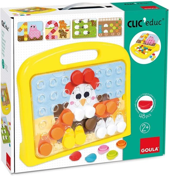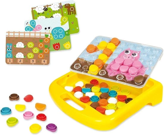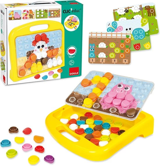 An entertaining game of mosaics! A practical case that holds 48 large, ergonomically-shaped plastic pieces, to make them easier for the smallest children to hold into. Put the illustrated template on the transparent base, allowing you to see the mosaic that you want to copy. In this case you will find 16 different drawings based on the animals of farm .. The case is easy to carry. This allows you to fit all of the pieces inside.