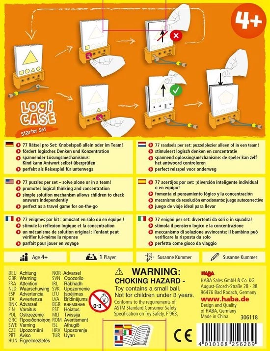 Kleurrijk, uitdagend, afwisselend – dat zijn de Logic! CASE-raadselsets. Het doel is om de meest uiteenlopende opdrachten te ontgrendelen en op te lossen. De speler kan zijn/haar antwoord zelf controleren met de houten pin. Kan men de kaart eruit trekken of niet? Dit versterkt de motivatie en vaardigheid om een probleem zelfstandig op te lossen. Is een raadsel opgelost? Dan wacht de volgende uitdaging al! Met de Logic! CASE-uitbreidingssets kunnen de starterssets eenvoudig en flexibel worden uitgebreid op basis van thema en moeilijkheidsgraad. Zo blijft het altijd spannend!