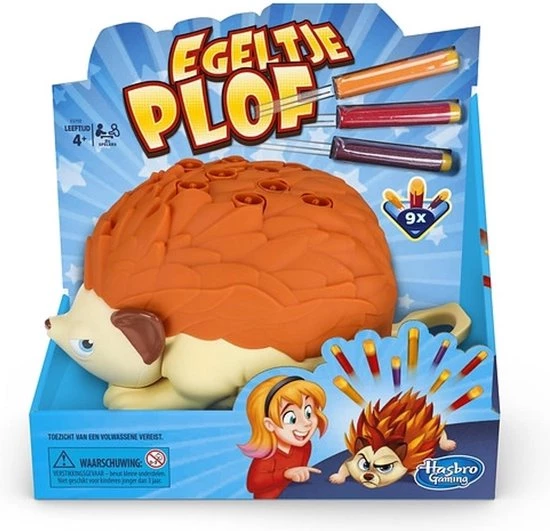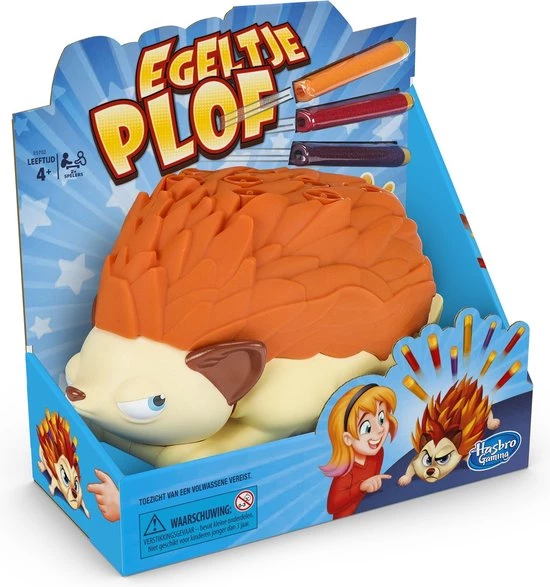 Wie laat Egeltje Plof uit zijn vel springen? Egeltje Plof is een eenvoudig spel voor kinderen met grappige en spannende momenten. Gooi de dobbelsteen en druk zo vaak als het cijfer dat je hebt gegooid op de neus van het egeltje. Nu maar hopen dat zijn darts niet omhoog schieten. Niemand weet wanneer dat gebeurt en de enige speler bij wie hij niet uit zijn vel is gesprongen, wint het spel.