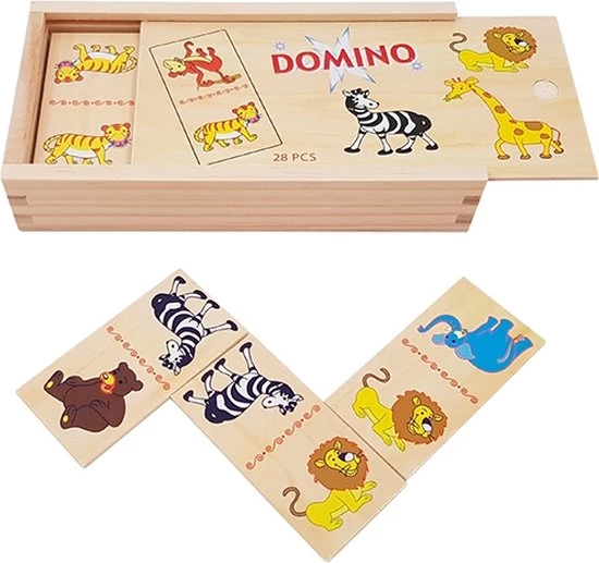 Houten domino spel met leuke vrolijke afbeeldingen van jungle dieren. De plaatjes zijn erg duidelijk en goed te herkennen. De afbeeldingen van de dieren zijn vrij gemakkelijk bij elkaar te zoeken.