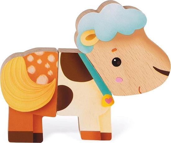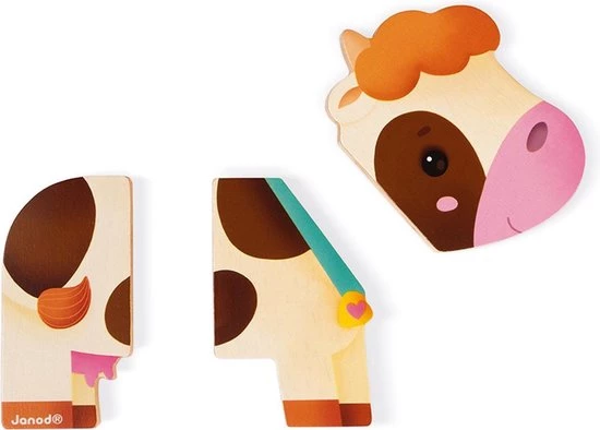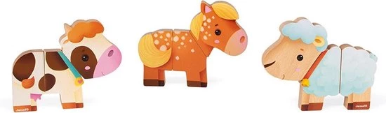 Houten speelgoed. Voor kinderen van 18 tot 36 maanden. 3 dieren in 3 magnetische delen: loshalen, creatief mixen en weer samenvoegen. Een leuk combinatie- en verbeeldingsspel.