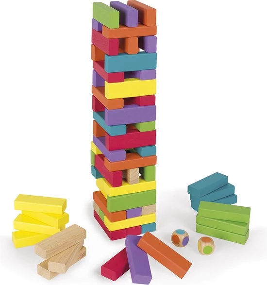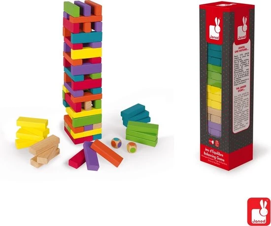 Het spel evenwichtstoren van Janod is erg spannend! Bouw de toren op de moeilijkste manier. Dobbel met de dobbelsteen, de kleur die is gegooid moet ook werkelijk uit de toren worden gepakt, maar kijk uit! De toren kan elk moment omvallen! De persoon die de toren laat omvallen heeft verloren of de persoon met de meeste stenen heeft gewonnen. Geschikt voor kinderen vanaf 3 jaar.