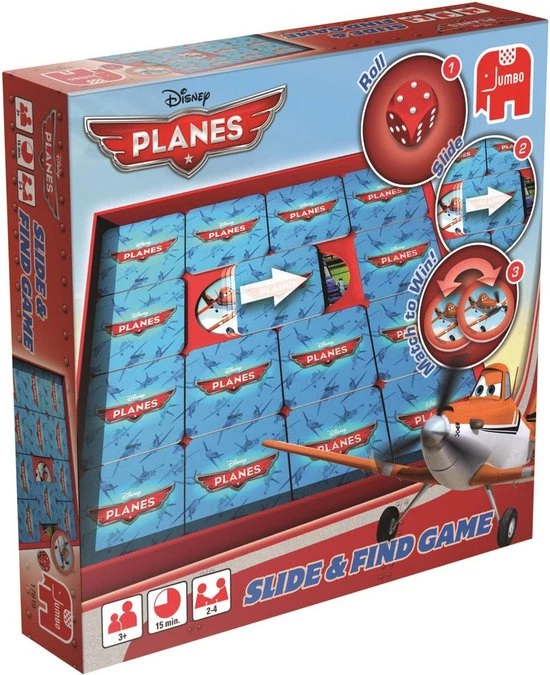 Disney Planes schuif en vind is een nieuw en spannend memospel. Het is niet zomaar een geheugenspel. Je moet er ook een beetje geluk bij hebben. Draai één van de speelkaarten om, gooi de dobbelsteen en probeer hetzelfde plaatje te zoeken door telkens één van de schuifkaarten te verplaatsen. Wie aan het einde van het spel de meeste plaatjes gevonden heeft, is de winnaar!