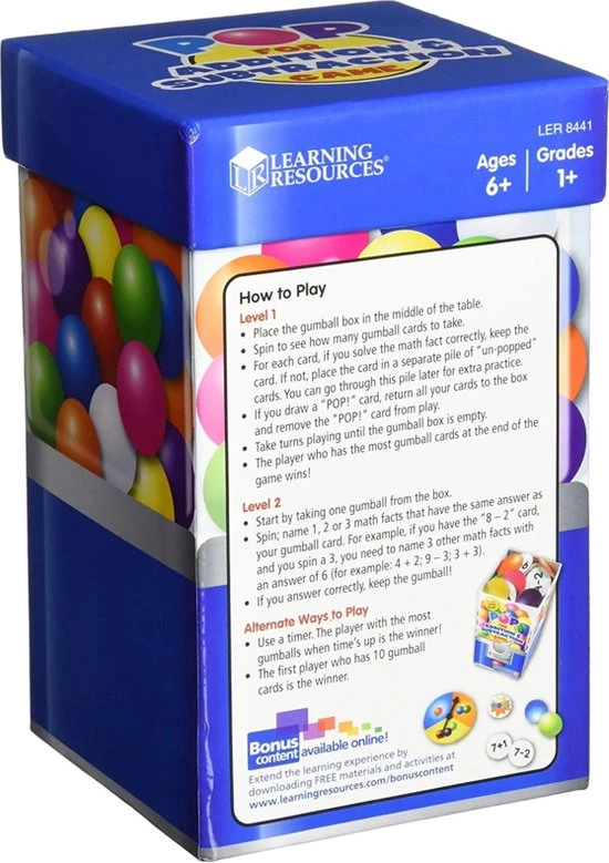 - Inclusief spinner, 90 kwauwgombalkaarten met een som erop en 10 POP-kaarten