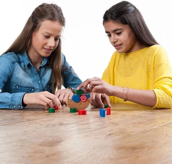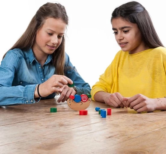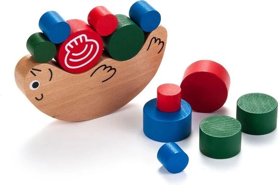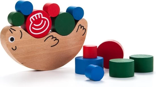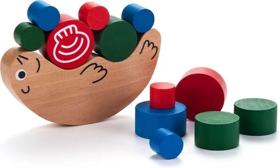 Verdeel de houten blokjes, ieder krijgt zijn eigen kleur. Elke speler plaatst zijn eigen houten blokjes op de zeehond, zonder dat dat hij omvalt! Dit houten balansspel helpt de oog/hand coördinatie te verbeteren.