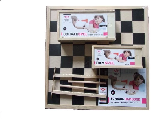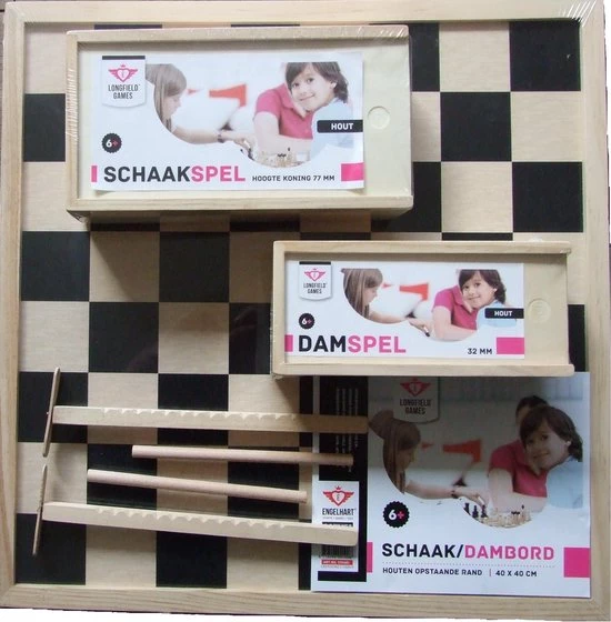 Longfield Games Compleet dambord/schaakbord met schaakstukken en damstenen. Aan de ene kant een dambord en aan de andere kant een schaakbord. Het bord heeft een afmeting van 40 x 40cm en is inclusief houten damstenen 32mm en schaakstukken hoogste koning 77mm. De damstenen en schaakstukken zitten verpakt in een handig opbergdoosje. U ontvangt 20 zwarte en 20 witte damstenen. U ontvangt 16 zwarte en 16 witte schaakstukken.