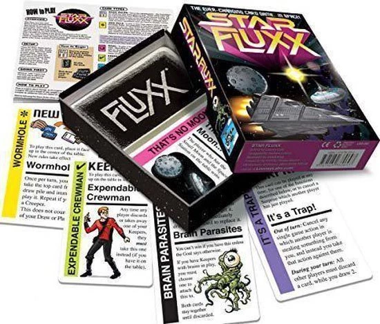 De sky is the limit; maar dat geldt niet voor Star Fluxx! Deze expansieset voor het kaartspel Fluxx combineert 100 space-gerelateerd kaarten (zoals Small Moon en Cute Fuzzy Aliens) met de eenvoudige spelregels van Fluxx. Pak een kaart; speel een kaart en het spel volgt zichzelf!