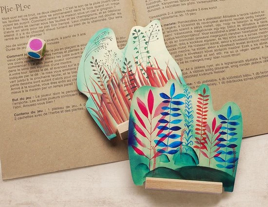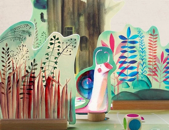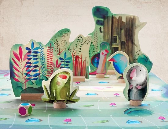 Inhoud: 1 spelbord, 4 verschillende pionnen, 1 boomstamhuisje, 2 schuilplaatsen met gras en bloem, 1 dobbelsteen met gekleurde stippen