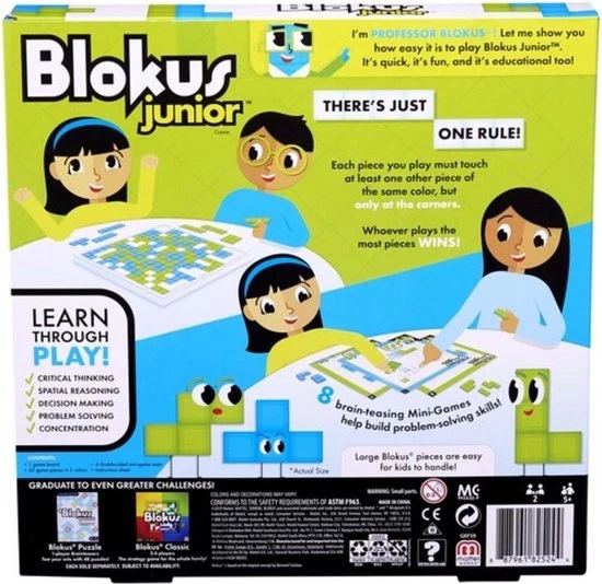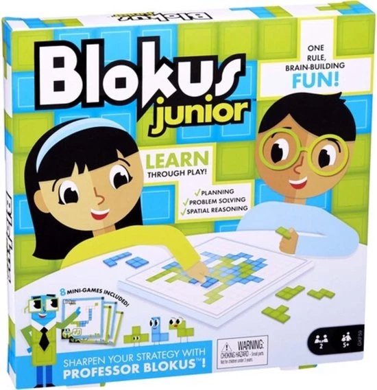 Blokus Junior is een strategisch spel voor jonge spelers vanaf 5 jaar! Net als Blokus, het snelst groeiende strategisch spel, is het doel van dit spel om zoveel mogelijk stukken op het bord te krijgen door deze op elkaar aan te laten sluiten. Speciaal ontworpen voor jonge spelers heeft Blokus Junior minder ingewikkelde speelstukken, een groter bord en 10 minispelletjes waarmee kinderen het spel onder de knie krijgen.
