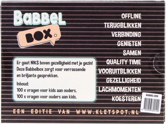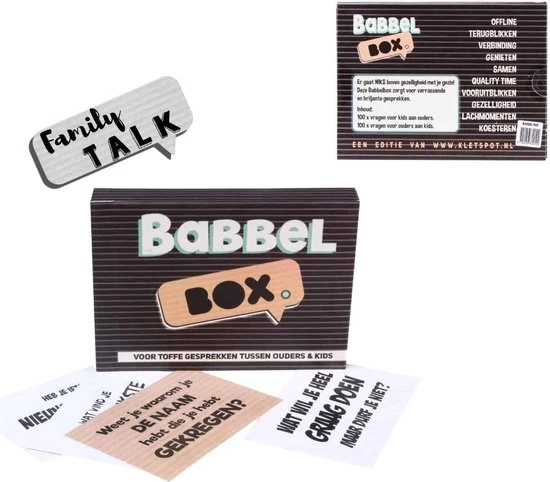 BabbelBOX: Voor de meest verrassende gesprekken aan de keukentafel. Deze Babbelbox heeft briljante en superleuke Kletsvragen voor het hele gezin. 100 x voor kids aan ouders 100 x voor ouders aan kids