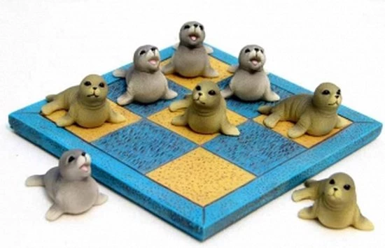 Boter kaas en eieren met zeehondjes. Boter kaas en eieren spelletje met zeehonden poppetjes. De zeehondjes hebben verschillende kleuren zodat deze makkelijk te onderscheiden zijn. Het spel is ongeveer 20 x 20 cm en gemaakt van steen.