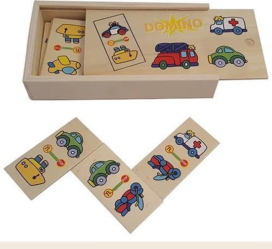 Een domino spel van houten kaartjes, verpakt in houten kistje. Op de kaartjes staan afbeeldingen van verschillende voertuigen. Leuk om te spelen. Leg dezelfde afbeeldingen bij elkaar, wie het eerste uit is heeft gewonnen!