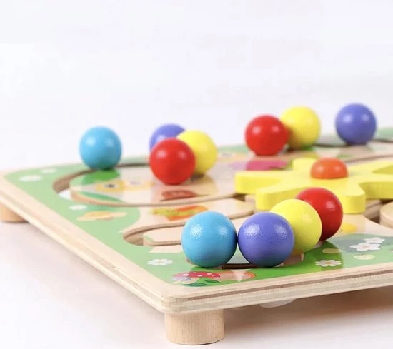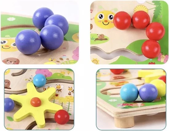 Deze leuke rups labyrint/ schuifpuzzel is echt ideaal voor de allerkleinste kinderen. Zo leren ze spelenderwijs puzzelen en schuiven met de gekleurde houten kralen. Ze moeten proberen om de rode, blauwe, paarse en gele kralen in de juiste hoek te krijgen. Ze komen dan langs diverse beestjes en de grote draaiende zon op het houten speelbord. Maar de grote draaiende zon kan ze ook in de verkeerde hoek schuiven. Deze leuke rups doolhof/ schuifpuzzel leert de kleine kinderen bij de ontwikkeling van de fijne motoriek en een goeie hand en oog co?rdinatie en geeft gewoon heel veel plezier bij het puzzelen. Spelenderwijs oefent jouw peuter de fijne motoriek, kleur herkenning en logisch nadenken.