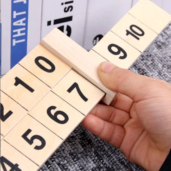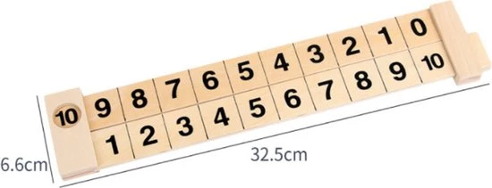 Het rekenplankje bestaat uit 2 plankjes die je uit elkaar kunt schuiven. Wil je plus-sommen oefenen? Dan is het cijfer in de ronde uitsparing de som van de 2 getallen die ernaast onder elkaar staan. Bijv. 10 = 9 + 1, maar ook 8 + 2 en 7 + 3 enz.