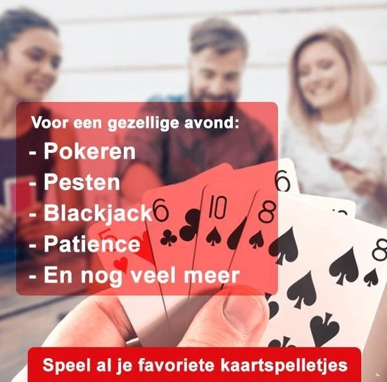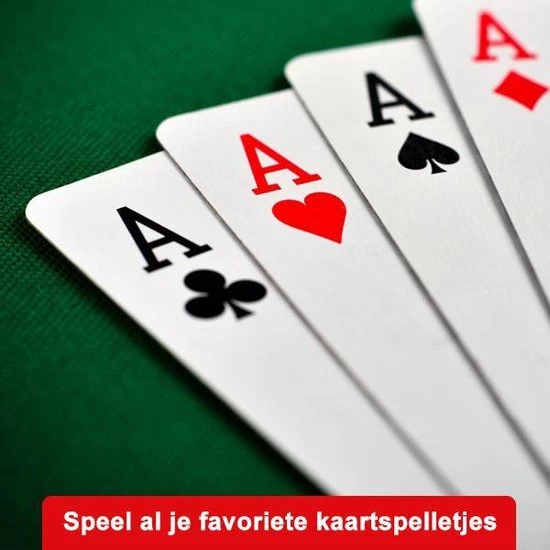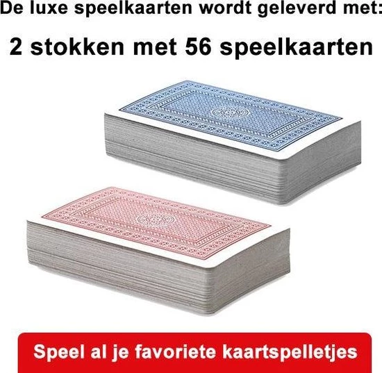 Bij aankoop van dit product ontvangt u 4 decks met 56 kwalitatieve speelkaarten, verdeeld in de kleuren rood en blauw. Bovendien krijgt u ook een bewaardoosje, hiermee kunt u de kaarten veilig en compleet bewaren. Zo kunt u jarenlang genieten van uw kaarten!