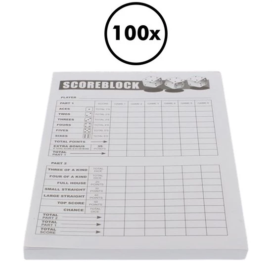 Er zijn zes vakjes op de BOVENSTE HELFT (kenmerkend aan het aantal ogen van de dobbelsteen) van het scoreblad en zeven vakjes op de ONDERSTE HELFT (kenmerkend aan de combinaties van het aantal ogen van de dobbelsteen). De volgorde waarin je de vakjes invult bepaal je zelf, maar er dient altijd een score ingevuld te worden. Dit is verplicht. Heb je 3 keer gegooid maar kun je nergens een antwoord invullen dan moet je een vakje afstrepen of er een 0 in zetten. Als je alle dertien vakjes hebt ingevuld, tel je jouw punten op met eventuele bonuspunten op. De speler met het hoogste aantal punten in het vakje ‘Totaal’ heeft gewonnen.