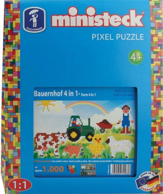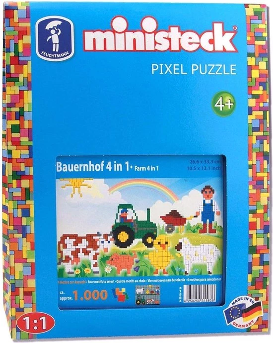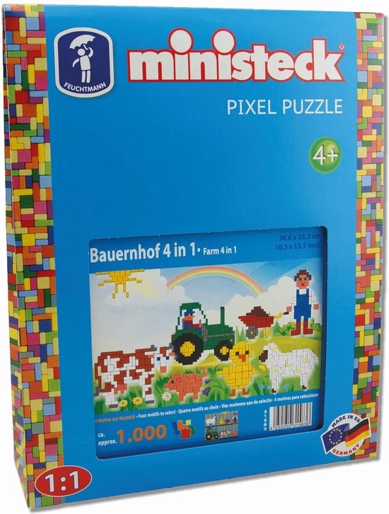 Deze pixel-puzzel van Ministeck bevat ongeveer 1000 gekleurde steentjes die jij in het insteekbord kunt steken om zo leuke figuren te maken die over het thema boerderij gaan. Zo kan je met de Ministeck-steentjes diverse dieren maken zoals een koe, varken, schaap of kuiken. Maar vergeet ook niet de boer op zijn tractor of achter de kruiwagen. Door met Ministeck te spelen stimuleer je de fijne motoriek, creativiteit en het concentratievermogen.