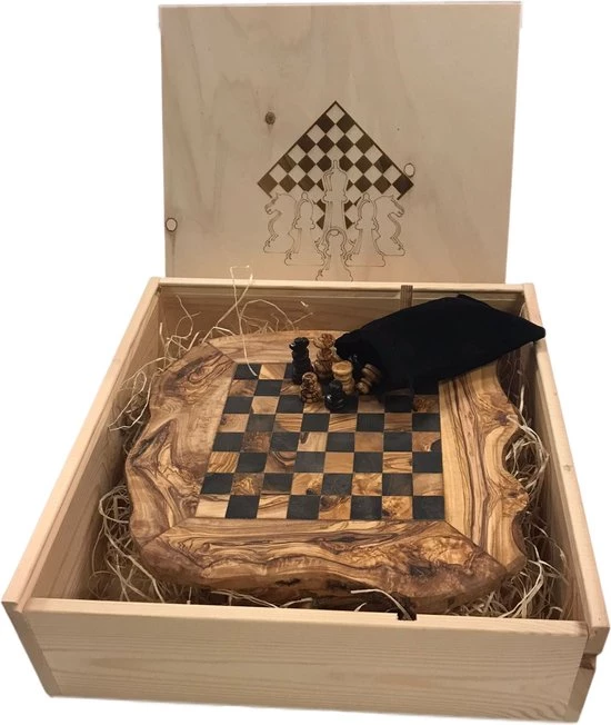Een prachtig handgemaakt Schaakbord van Olijfhout verpakt in een Cadeaukist. Een mooi en luxe Geschenkpakket.