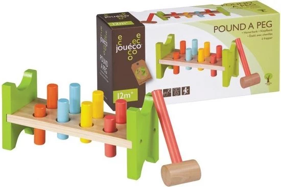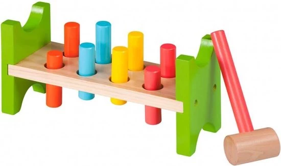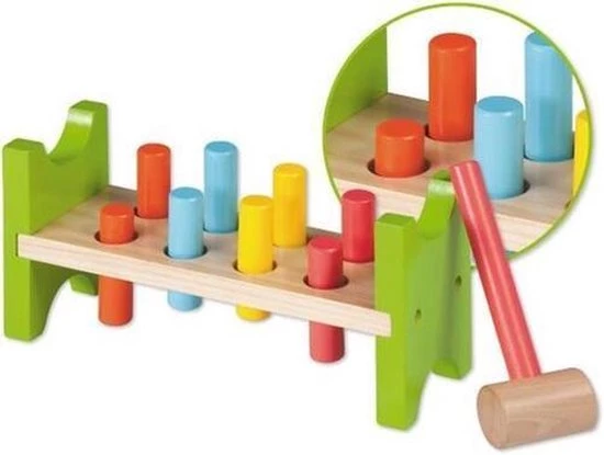 Pak de hamer er bij en sla de staafjes steeds een stukje dieper in de Hamerbank.. Dit product is vervaardigd van stevig hout en verschillende onderdelen zijn gekleurd.