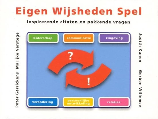 Het Eigen Wijsheden Spel bestaat uit 144 kaarten. Op de voorzijde van de kaarten staat een citaat, op de achterzijde een vraag, gekoppeld aan het citaat. In veel gevallen zult u alleen met de vragen of alleen met de citaten werken. De citaten zijn verdeeld over zes thema’s: leiderschap, communicatie, zingeving, verandering, persoonlijke ontwikkeling en relaties. Per thema zijn er 20 – 25 kaarten.