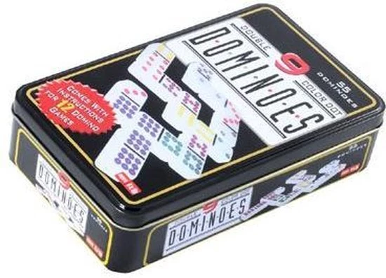 Domino spel in gekleurd blik met deksel. Afmetingen 50 x 25 x 10mm. Stenen van urea kunststof met gekleurde ogen. Inclusief spelregels.