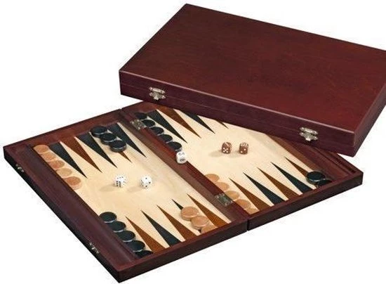 De Philos Backgammon Tilos heeft een mdf koffer van 410 x 240 x 50 mm, bordeaux gebeitst. Met een bedrukt speelveld, steenvakken, houten speelstukken en dobbelstenen.