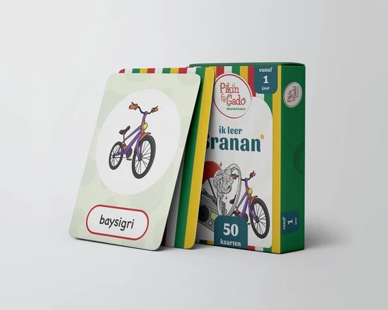 In deze doos zitten 50 kaarten met alledaagse woordjes in het Surinaams. Met deze speel- en leerkaarten wordt nieuwe woordjes leren een feest! Door op een leuke manier met Surinaamse woordjes bezig te zijn, vergroot je spelenderwijs de woordenschat. De afbeeldingen op de kaarten helpen om de woordjes sneller en makkelijker te onthouden. De ideale manier om snel Surinaams te spreken!