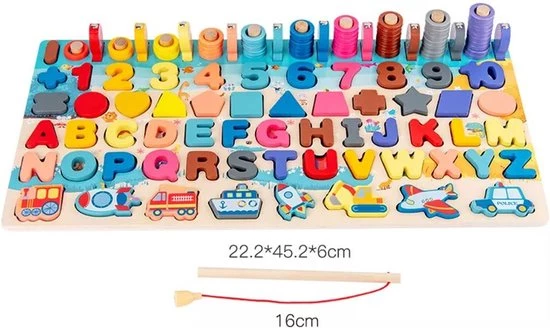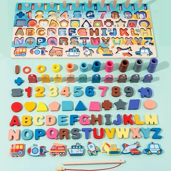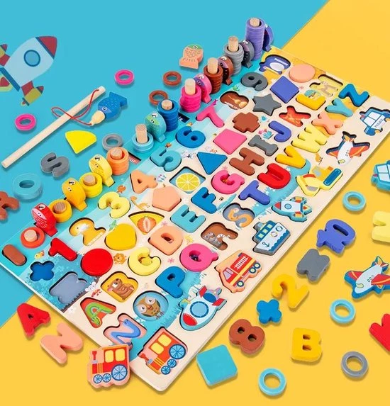 Materiaal: houten cijfers, blokken, letter en figuren / plastic ringen voor tellen