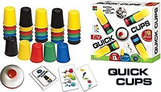 QUICK CUPS is het snelle familiespel waarbij kopjes bij elkaar worden gebracht en op een foto worden gestapeld! Elke speler krijgt een set van vijf kopjes in vijf verschillende kleuren. Wanneer een afbeeldingskaart wordt omgedraaid, racet iedereen naar de rij of stapelt zijn bekers op in dezelfde volgorde