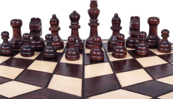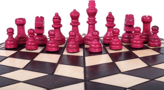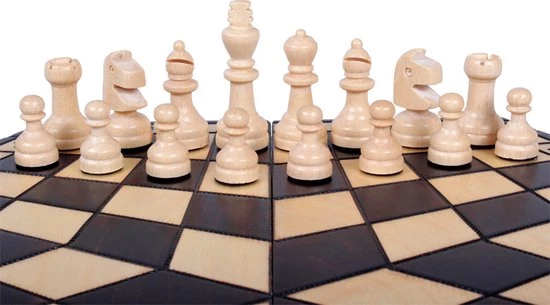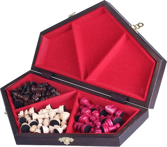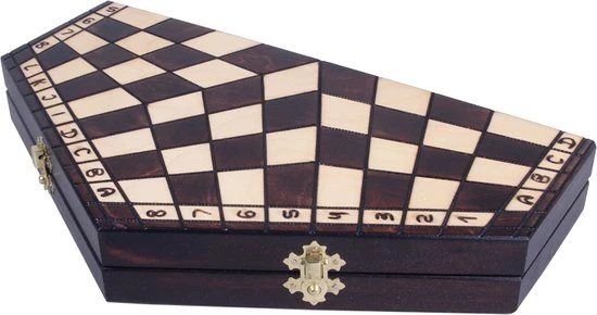 Een uniek schaakspel voor 3 spelers. Gezien zijn middelgrote formaat wordt het beschouwd als een voordelige set. De vouwkoffer is leverbaar in de standaard (bruine) kleur en andere kleuren op aanvraag. De schaakstukken zijn gemaakt van haagbeuk en beukenhout. Bij elke set is een folder met de spelregels toegevoegd. Het heeft drie compartimenten afgewerkt met vilten voering voor de opslag van schaakstukken binnenin.
