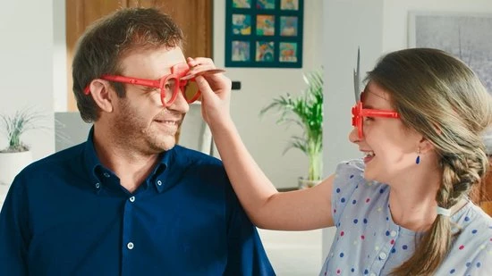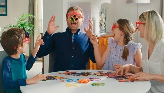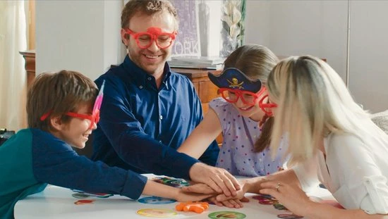 Brillen op, klaaaar? AF!! Probeer als eerste met je hand op het gegooide symbool te slaan. Zoek dan een overeenkomstig onderdeel voor een medespeler uit en hang het aan zijn of haar bril. Wie ziet er als eerste hartstikke gek uit?