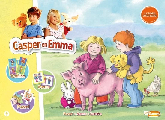 Casper en Emma zijn 5-jarigen die van alles samen beleven. Ze hebben allebei een knuffel: Caspers knuffel heet Welpje en Emma?s knuffel heet Mevrouw Konijn. Deze knuffels kunnen praten! Casper en Emma nemen hun knuffels overal mee naartoe. Beleef urenlang speelplezier met een Casper en Emma-puzzel, -domino en -memospel, allemaal in een handig meeneemkoffertje!