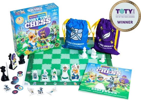 Story Time Chess is a board game that teaches chess to young children using silly stories, vibrant illustrations, custom chess pieces, and a unique chess board. The stories and supporting materials communicate the rules of chess to children ages 3 and up in a way that makes learning chess simple and fun. Best of all, no chess experience is required for parents or children to learn.