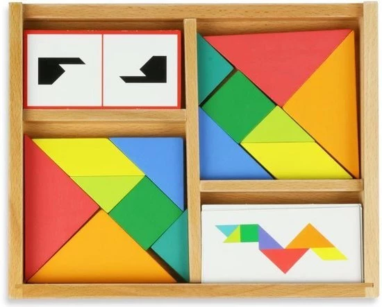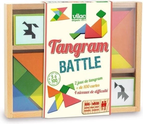 Dit tangramspel van Vilac is voor 1 of 2 spelers. Er zijn twee setjes van 7 houten tangram stukjes en een stapel van 100 opdrachtkaartjes. Wie heeft als eerste de figuur op het kaartje gelegd? Er zijn vier moeilijkheidsniveau’s om mee aan de slag te gaan, de kaartjes hebben afbeeldingen in kleur of in zwart wit. Alles is bewaard in een mooie houten bewaardoos. Een tof spel geschikt voor kinderen vanaf 5 jaar. En leuk tot je 95ste!